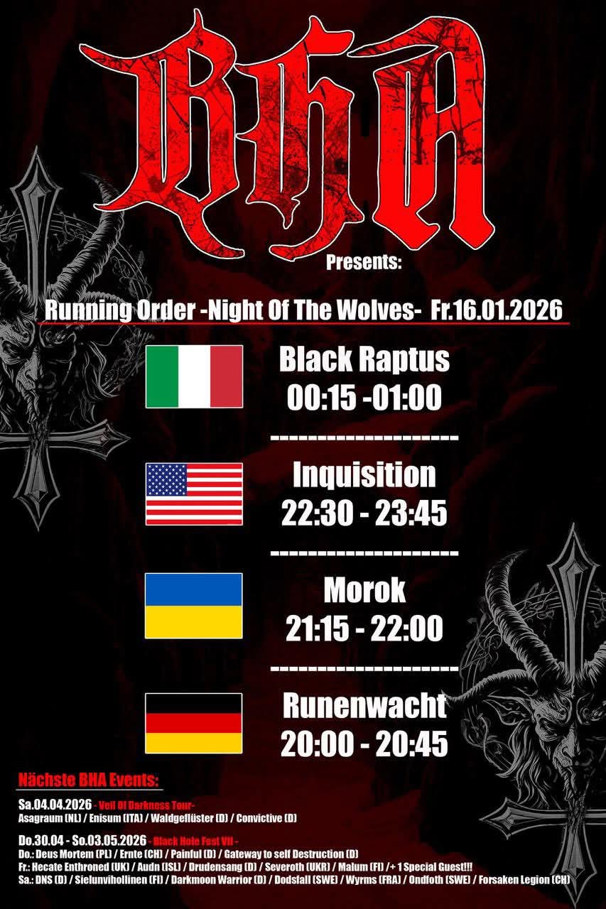 Neben den Südamerikanischen Old-School Vorreitern Inquisition, treten als Deutscher Support Runenwacht, sowie die Ukrainer Morok und die Italiener Black Raptus auf und werden die Musigburg in eine stählerne Feste verwandeln.