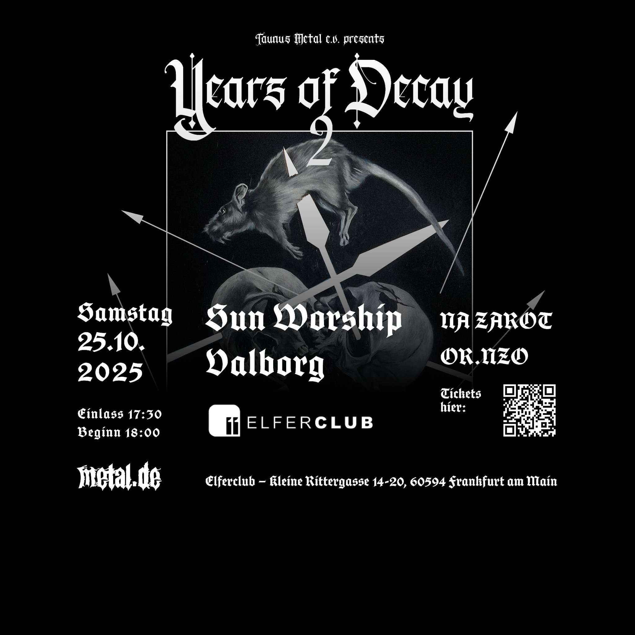 Am 25. Oktober versammeln sich im Elferclub Frankfurt am Main vier Bands zur zweiten Ausgabe des Years of Decay: Sun Worship, Valborg, Na Zarot und Or.Nzo. Nach dem starken Auftakt im Bett Club erhebt sich nun der zweite Teil der Konzertreihe – diesm...
