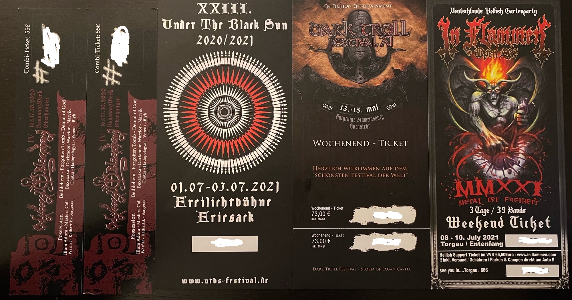 In 2021 haben wir ein bisschen Geld zusammengeschmissen um in unsicheren Zeiten Support-Tickets von einigen Festivals zu kaufen. Diese möchten wir jetzt an EUCH weitergeben, damit ihr das gesparte Geld in Getränke und Merch bei den Bands umsetzen könnt!