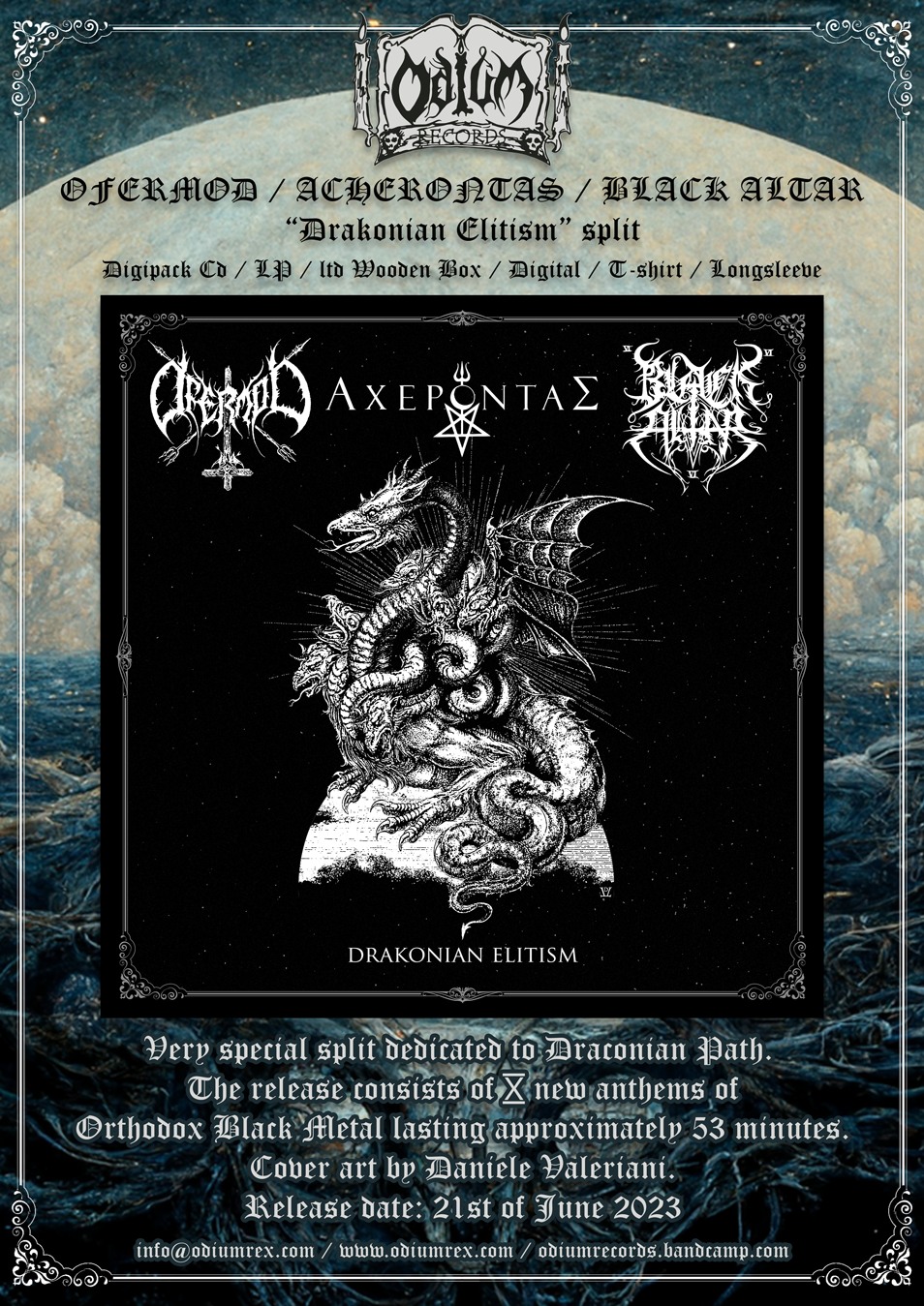 Das mittlerweile in London ansässige Label Odium Records kündigte für den Juni ein höchst spannendes Release an: Unter dem Titel "Draconian Elitism" wird am 21.06.2023 eine 3-Way Split von den drei hochkarätigen Bands Ofermod, Αχέροντας (Acherontas) und Black Altar erscheinen. Schon jetzt ist an der Tracklist zu erkennen, dass es 10 neue Songs der drei Kapellen geben wird, die sich auf eine stolze Full Length-Platte von ca. 53 Minuten Länge erstrecken.