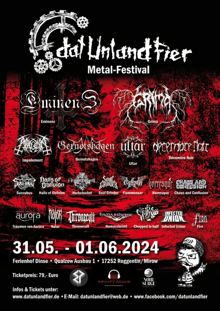 Das Festival Dat Unland Fier besticht mit tollem Konzept: Black Metal dominiert, Death Metal und Doom sind gut vertreten und auch Thrash ist dabei - das Ganze findet statt auf einem offenen Gelände mitten im Idyll der Wald- und Seenlandschaft der Mecklenburgischen Kleinseenplatte.
