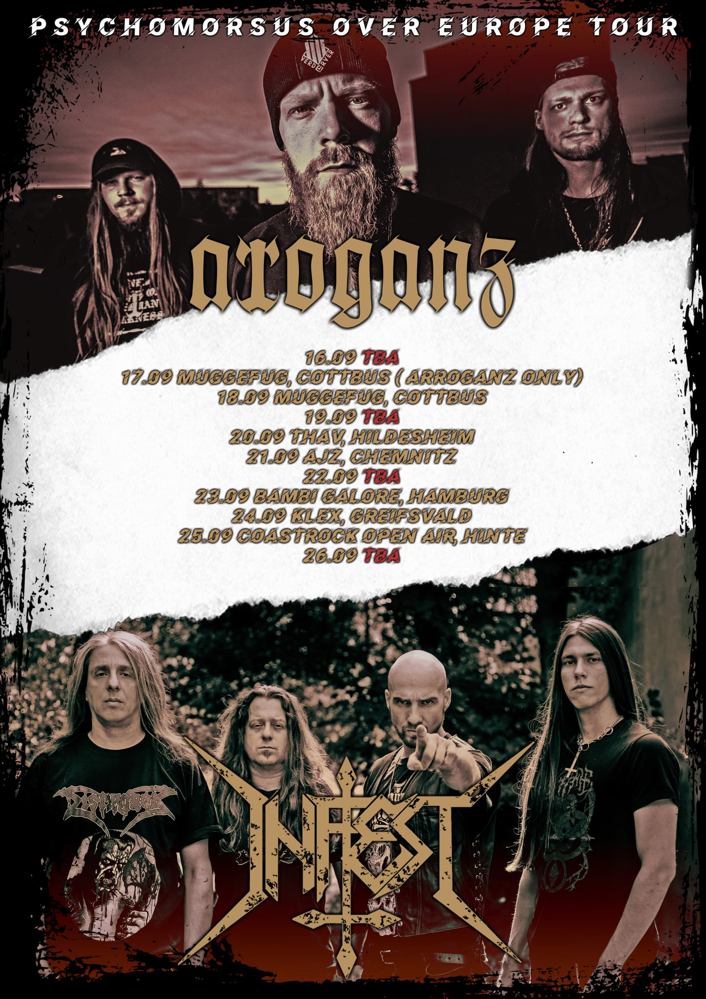 Arroganz preschen mit optimistischem Tatendrang voran und verkünden die Tour zur Feier des 10. Jubiläums ihres Debütalbums "Dark and Deathless". Außerdem jährt sich der Release ihres jüngsten Full-lengths "Morsus" zum ersten Mal. Die Tour soll schon im frühen Herbst unter dem Motto "Psychomorsus over Europe" stattfinden. Unterstützung bekommen sie von den serbischen Death Thrashern von Infest.