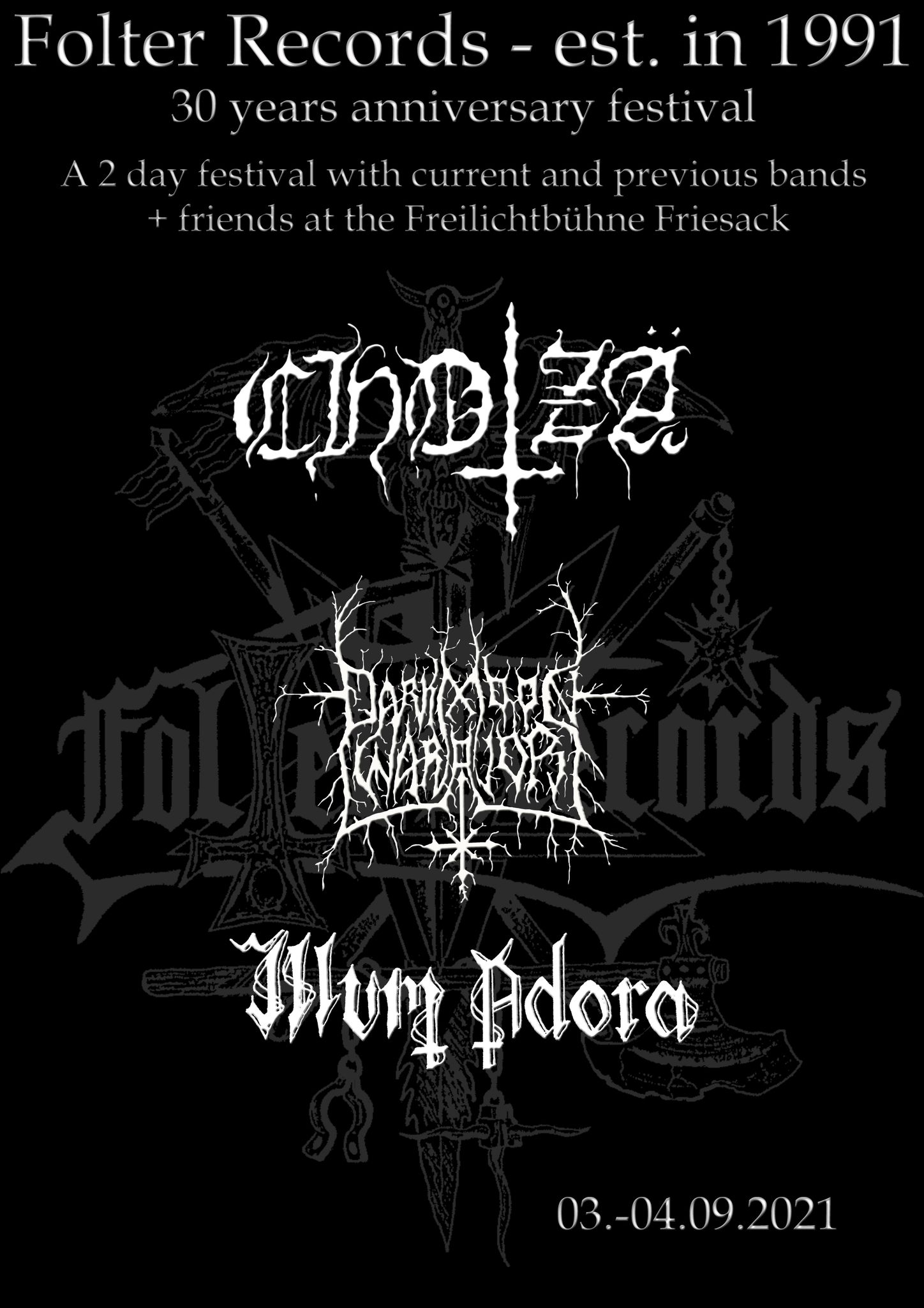 Folter Records feiert sein 30-jähriges Bestehen! Um dies gebührend zu zelebrieren, wird es am 03. und 04. September an der Freilichtbühne in Friesack laut. Die ersten drei Bands für das 2-tägige 30 years anniversary festival stehen schon fest: Chotzä, Darkmoon Warrior und Illum Adora.