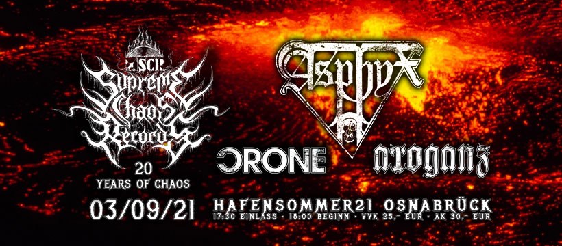 Supreme Chaos Records feiern in diesem Jahr ihr 20-jähriges Bestehen. Das muss natürlich gebührend gefeiert werden. Im Rahmen des Osnabrücker HafenSommers 2021 soll die Jubiläums-Sause am 03. September 2021 steigen. Auftreten werden die Label-Aushängeschilder Asphyx, Crone und Arroganz