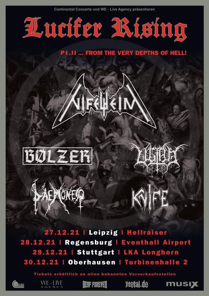 Unter dem Namen Lucifer Rising bekamen wir von "Continental Concerts" und der "WE Live Agency" Ende 2019 schon einmal eine kleine aber hochpotente Minitour einiger Szenegrößen präsentiert. Mit dem Pt. II wird nun Ende Dezember nochmal richtig aufgestockt und mit den Urgesteinen Niflheim, den Schweizern Bölzer, den Doom Blackmetallern Ultha, den female Fronted Daemonesq sowie den Speed-Punk Schwarzmetallern von Knife das Ende des Jahres 2021 eingeläutet.