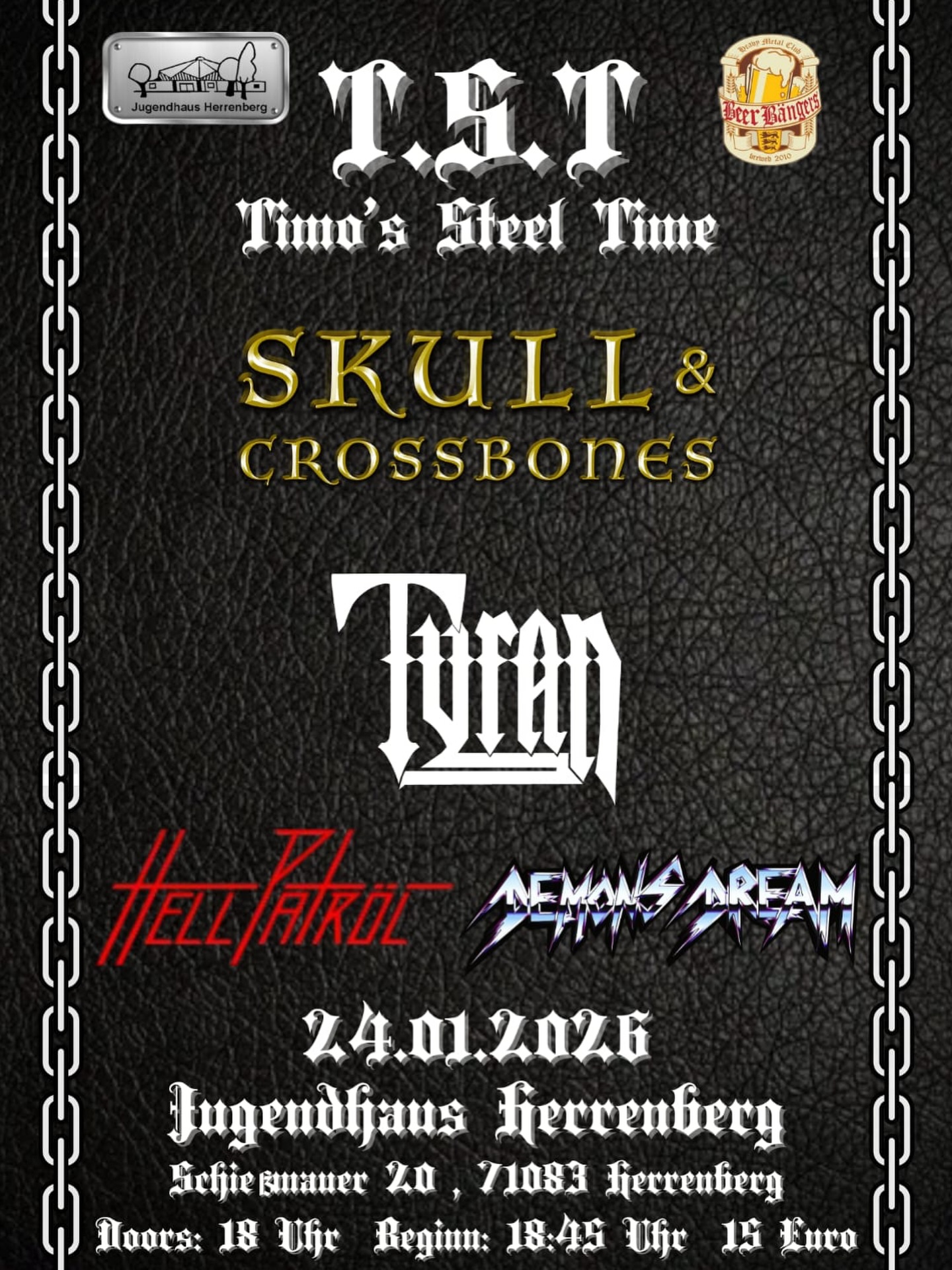 Regionale Events sind immer eine feine Sache, vor Allem wenn sie auch für den Underground einiges zu bieten haben. Leider geschieht das immer selterner, doch der Heavy Metal lebt immer noch in der Region um Stuttgart und so fand auch dieses Jahr das T.S.T im JuHa Herrenberg statt. Ein kleines aber feines Konzert bei dem Veranstalter Timo 4 handverlesene Bands zum Tänzchen auf den Brettern gebeten hat. Mit von der Partie waren dieses Mal Demons Dream, Hell Patröl, Tyran und Skull&Crossbones.