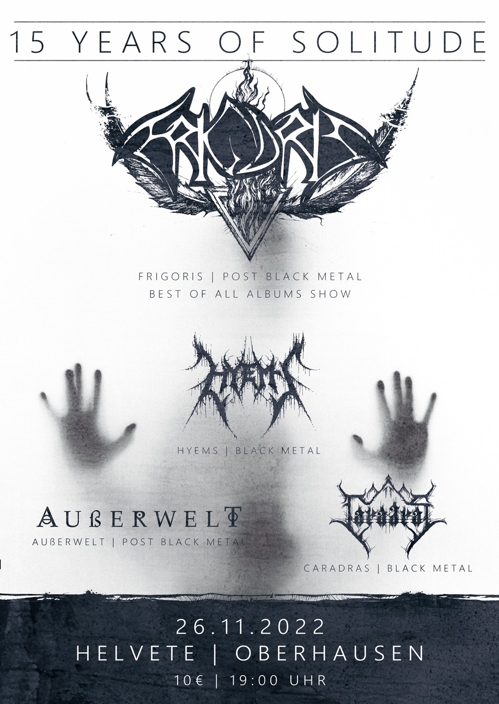 Am Samstag, den 26. November, luden die Essener Frigoris zu ihrem 15-jährigen Jubiläum ins Helvete Oberhausen. Unter dem Titel "15 Years of Solitude" lieferte die Post Black Metal-Band gemeinsam mit ihren Gästen Hyems, Caradras und Außerwelt einen Qu...